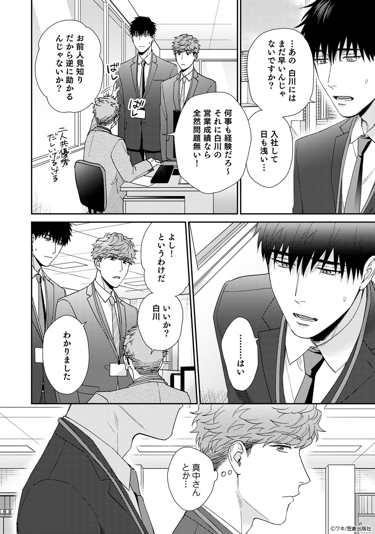 ドライな新入社員の白川は、自らを異様に避ける上司の真中と、出張先のホテルで一晩過ごすことに。
